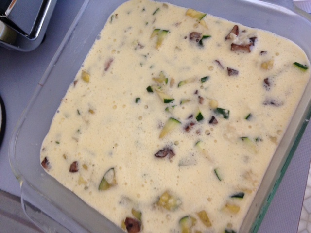 - Saute onion, zucchini and mushrooms in olive oil until soft. Place in bottom of prepared glass dish.