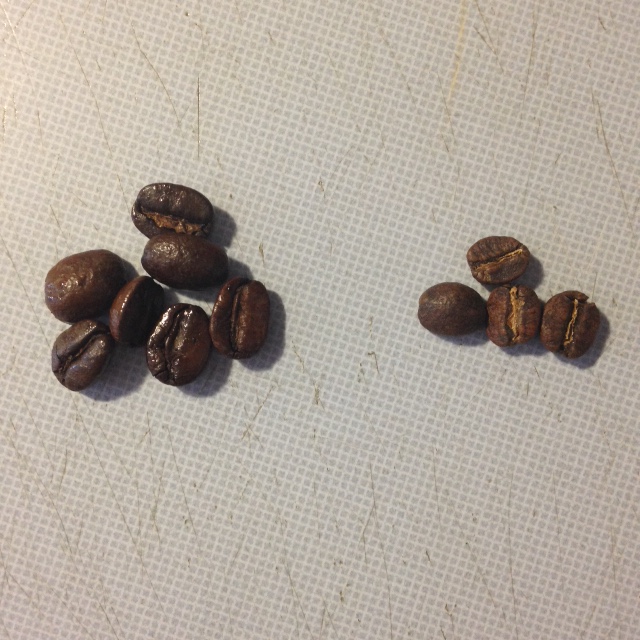 I was also surprised by the size of the beans when I opened up the bag. They seemed a bit smaller than I’m used to, so I compared them to my dark roast beans and they are a bit smaller.