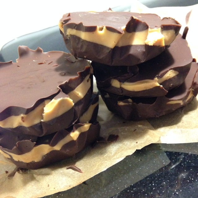 - Spoon chocolate in bottom of tin and then spoon peanut butter mixture followed by another layer of chocolate.