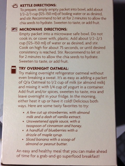 What’s really nice is that on the side of the box they offer a variety of ways to make your Qi’a like with a kettle, in the microwave, or overnight oats like I did.