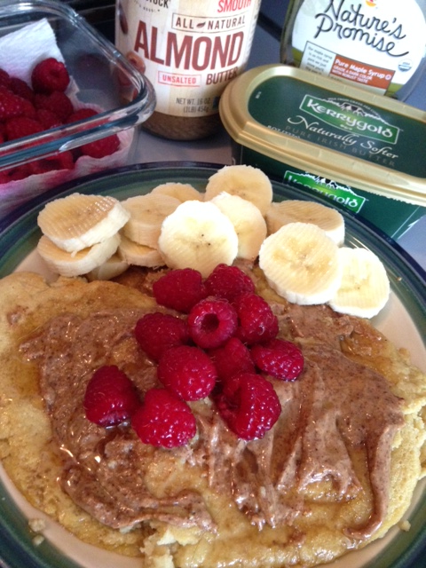 Top with butter (love my Kerrygold Irish Butter which is from grass-fed cows), Almond Butter, Raspberries, Banana’s and some organic maple syrup. Or whatever other toppings you would like. I love to add blueberries, strawberries and walnuts sometimes too. Have fun playing with it and I hope you enjoy!