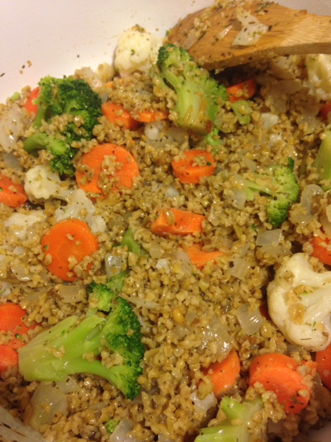 The next time I used the Rosemary Sage Freekeh I used leftover Freekeh by putting it in a pot after I sauteed up some onions with garlic and coconut oil. I kept stirring it to heat it up then added in some frozen veggies and heated all that up with a little more coconut oil. Then I made some yummy almond flour crusted crispy chicken in the oven and added that to the top so we had our very own mock “Chicken Fried Rice” for dinner. This definitely was my favorite way of eating the Freekeh and my husband even said it’s his new favorite meal!