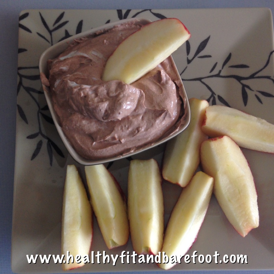 Happy Friday! It’s apple season so I’m doing a yummy chocolate protein fruit snack dip today that is so yummy to dip organic apples in! Apples are one of the most pesticide-sprayed fruits so I always recommend buying apples organic. My husband works at a fruit packing plant where they “wax” the apples to make them shiny…which to me, is pretty gross! I would much rather buy a non-shiny, wax-free, pesticide-free apple, and I’m fine with paying a little more for them. In the end, it’s much better for my health and for the environment.