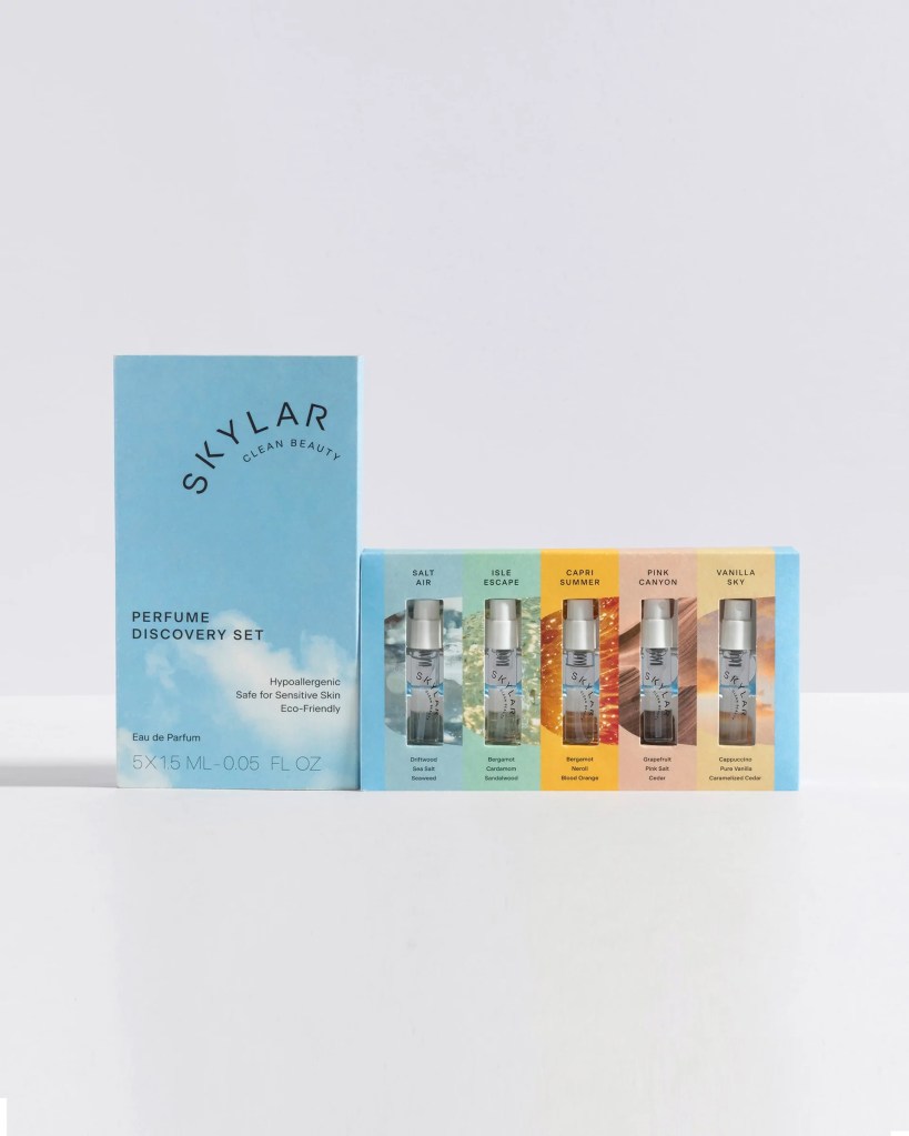 The Skylar Discovery Set is the gift that keeps on giving. Share the dreamy scents of Skylar with this curated mini perfume sampler with each of your loved ones. Explore crisp, clean, nature-inspired scents from their core collection of fragrances to build your scent wardrobe. Give the gift of discovering a favorite signature scent or finding a custom and unique layering combination. I love layering Salt Air with Vanilla Sky! or Coconut Cove with Vanilla Sky.