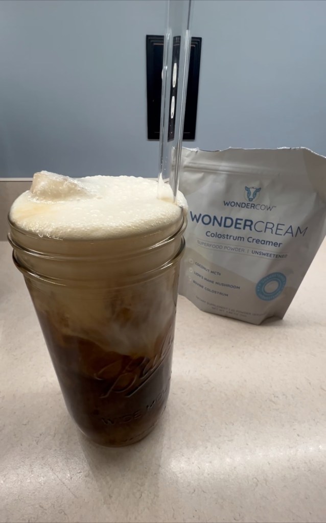 I mix their unflavored colostrum with my electrolyte drink daily. Two scoops is all you need and you don’t taste it at all. I also just tried their Elderberry colostrum which is delicious as an afternoon pick-me-up. Just mix it in water and you’re good to go! I also recently tried their WonderCream, which is a healthy coffee creamer. It contains Coconut MCT’s, Lion’s Main Mushroom and Colostrum and is unsweetened. This is a great way to switch over from those unhealthy store-bought-sugar-laden coffee creamers. I actually like my coffee black, but sometimes I want something a little creamy in my coffee and this hits the spot! It’s easy to mix and if you want a little flavor or sweetness just add 2 drops liquid vanilla stevia to it and it’s so yummy! I even did this and poured it over top of my iced coffee.