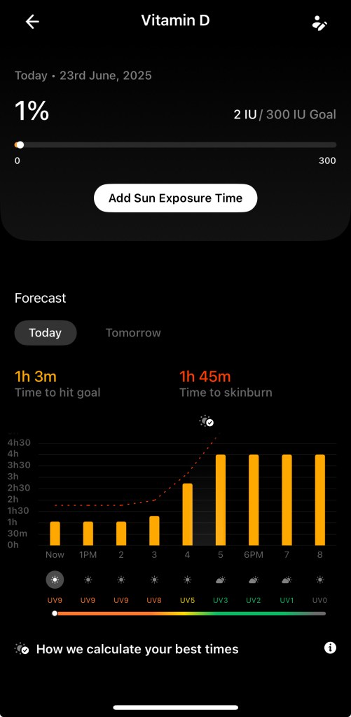 - Sunlight Timing: I follow the Vitamin D reminders to get outside when my body needs it most—game changer for energy and circadian balance.